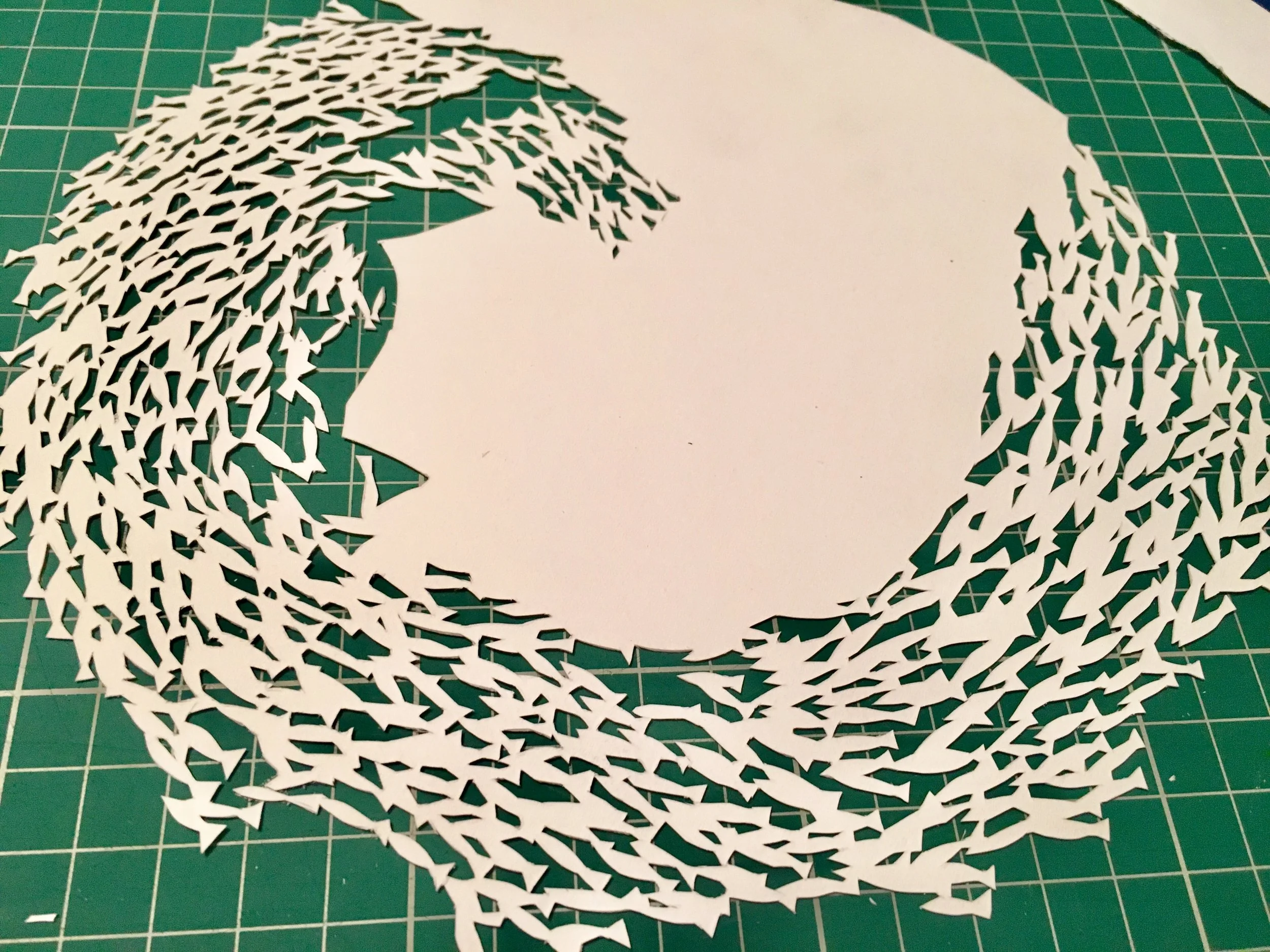 This multi-layered papercut light box captures a school of fish gliding in endless circles through a seakale forest. Inspired by the mysteries of the deep ocean and the BBC’s Blue Planet, the piece comes alive under the soft glow of LED light concealed within the frame.